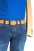 Correa en cuero 100% procesado de color Beige, pasador y hebilla de color café para contrastar, con dos lineas bordadas de color coral y camel para darle el estilo diferencial a la correa.