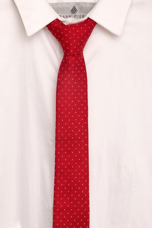 Frank PierceStock bajoCorbata Slim Preppy Corbata de color rojo intenso con pequeños puntos blancos alrededor del accesorio, un accesorios que llama la atención con un e...