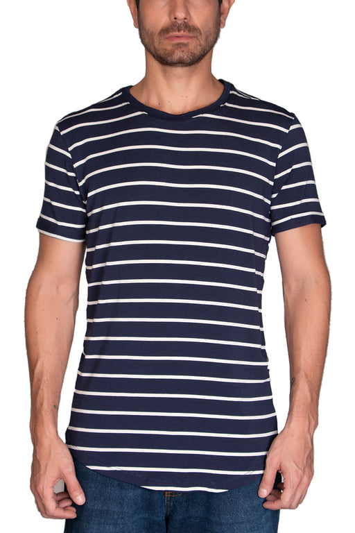 Frank PierceStock bajoCamiseta color azul, 50% algodón y 50% viscosa, detalla en el estampado a rayas de color blanco alrededor de toda la prenda, fresca. Ideal para oca...