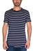Camiseta color azul, 50% algodón y 50% viscosa, detalla en el estampado a rayas de color blanco alrededor de toda la prenda, fresca.